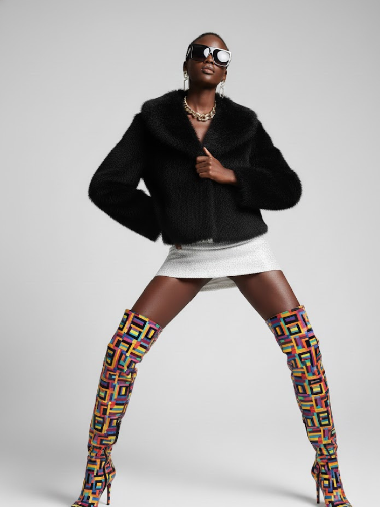 The BYMANYC Look: The model wears the Women's Faux Fur Jacket CHELSEA over a white or silver metallic or glitter mini-skirt, capturing the disco spirit and glamour of New York fashion. The outfit is completed with spectacular over-the-knee boots featuring a vibrant multi-colored geometric pattern and bold accessories: a thick gold chain choker and white-framed oversized sunglasses. This ensemble is a declaration of iconic style, ideal for after-parties or any avant-garde fashion event in Chelsea.